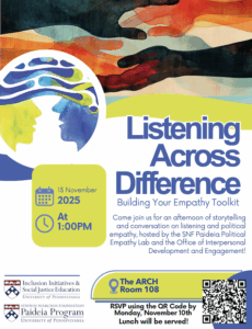 Come join us for an afternoon of storytelling and conversation on listening and political empathy, hosted by the SNF Paideia Political Empathy Lab and the Office of Interpersonal Development and Engagement.